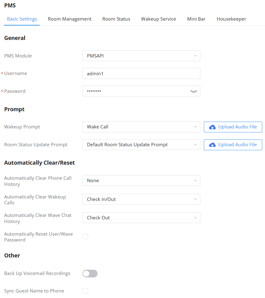 | PMS Password | Enter the password on the PMS Settings page. |