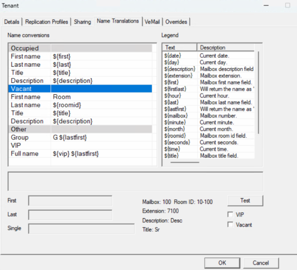 - By default under the 'vacant' table the 'first' and 'last' use the wild cards for the first and last name corresponding to the mailbox.