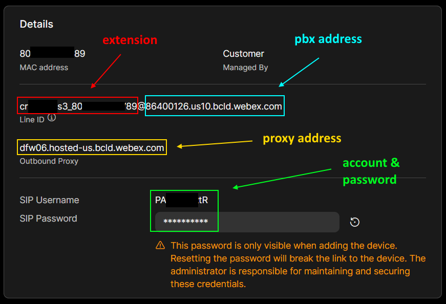 Webex isn't configured like a typical PBX. The DV2000 will connect to Webex as a SIP device. Below is where you can retrieve the information and how you will use it in the DV2000.