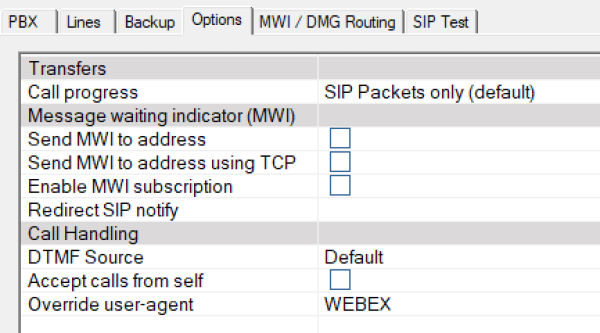 | Override user-agent | Enter WEBEX. This field is case-sensitive. This field can be modified while the system is running and is read on each call. |