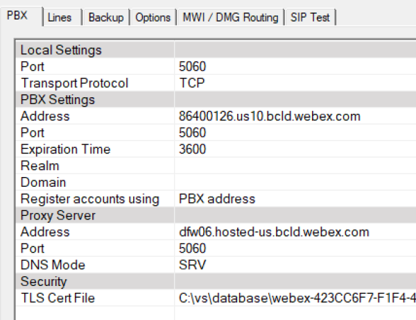main(163) Dynamic Outbound Proxy enabled main(172) SRV record found for proxy: sse-a24.public.wdfwwxc-p-2.prod.infra.webex.com 23.89.1.192:8934 with priority 5 and weight 50 main(176) Best SRV Record found: sse-a24.public.wdfwwxc-p-2.prod.infra.webex.com 23.89.1.192:8934 with priority 5 and weight 50 SIP Server: 86400126.us10.bcld.webex.com:5060 Proxy Server: dfw06.hosted-us.bcld.webex.com:8934 DuVoice IP address: 192.168.100.100:5060 Dialogic IP Address: 192.168.100.100 TLS Enabled, using file C:\vs\database\webex-423CC6F7-F1F4-4B78-BE45-2C323D1636D8idenTrustRootCA1.cert Transport Protocol TCP