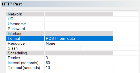 | URL | Blank | Enter full URL to post items to. Examples: http://127.0.0.1:8080/pbx or https://127.0.0.1:8080/pbx |