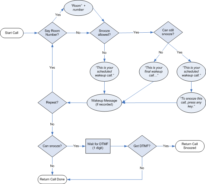 | Snooze enabled, with room number and scheduled time | Room <number>, this is your scheduled wakeup call, for <hh:mm am/pm>. To snooze this call, press any key. |