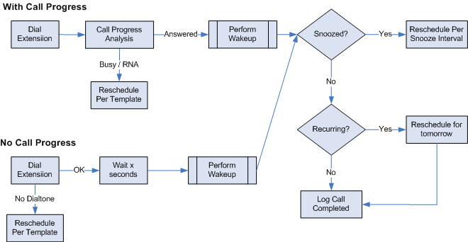 Which process is used depends on the configuration of the outdial settings on the Wakeup Calls tab for the class of service (COS) template. In most cases you will be using call progress, as it allows the system to detect busy and no-answer (RNA) conditions. As shown, a call that is not answered (whether due to RNA, busy or no dial tone) will be rescheduled to try again in accordance with the settings in the Wakeup Call notification template. If no more retries are allowed, then the wakeup call is marked as failed.