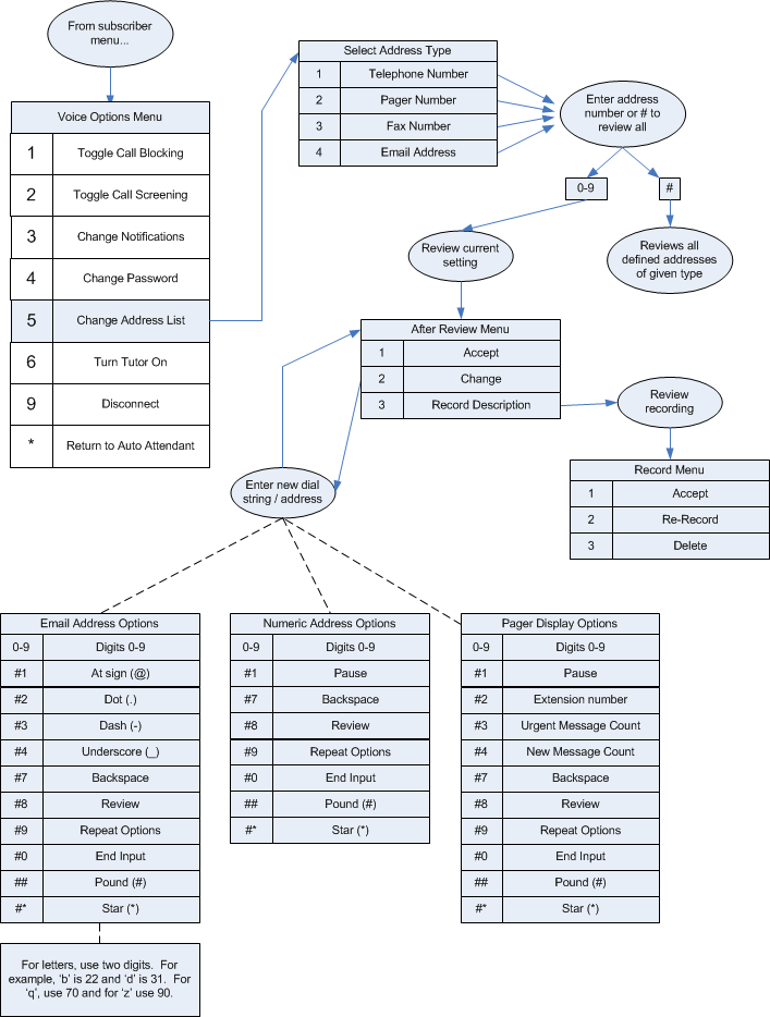 The process for entering an email address is necessarily a bit more cumbersome. In order to allow you to enter alphabetic characters, the system requires two keypresses for each character dialed, based on the standard telephone keypad. Thus, to enter the letter 'A', you must press the digits 21. To enter a letter 'B', press 22. And so forth. Since the letters 'Q' and 'Z' are not always marked on the keypad, use 70 for 'Q' and 90 for 'Z'. To enter a number 0-9, press the corresponding digit and then press #.