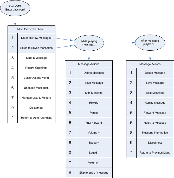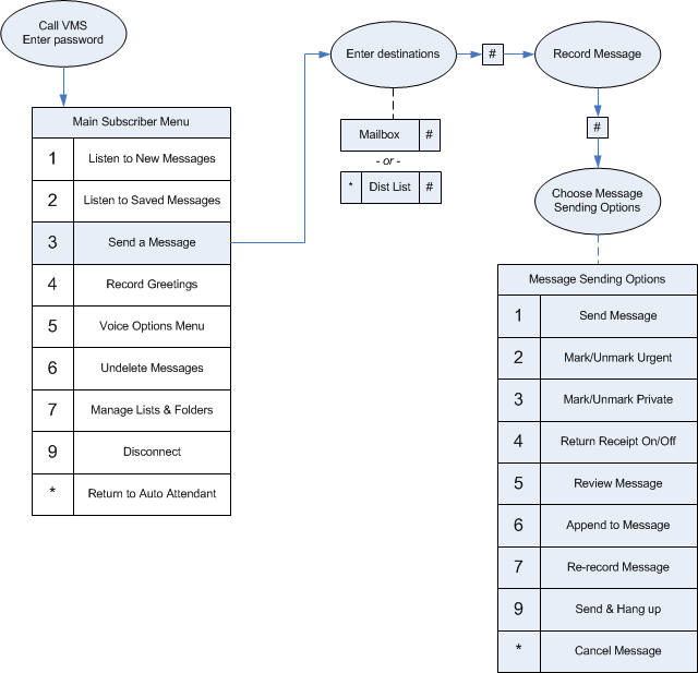The flowchart below provides an overview of how to configure additional subscriber settings and features; most of these options are dependent on your mailbox's class of service, so not all options may be available in your mailbox.