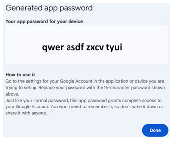 | Password | Enter the app password (NOT YOUR GMAIL PASSWORD). |