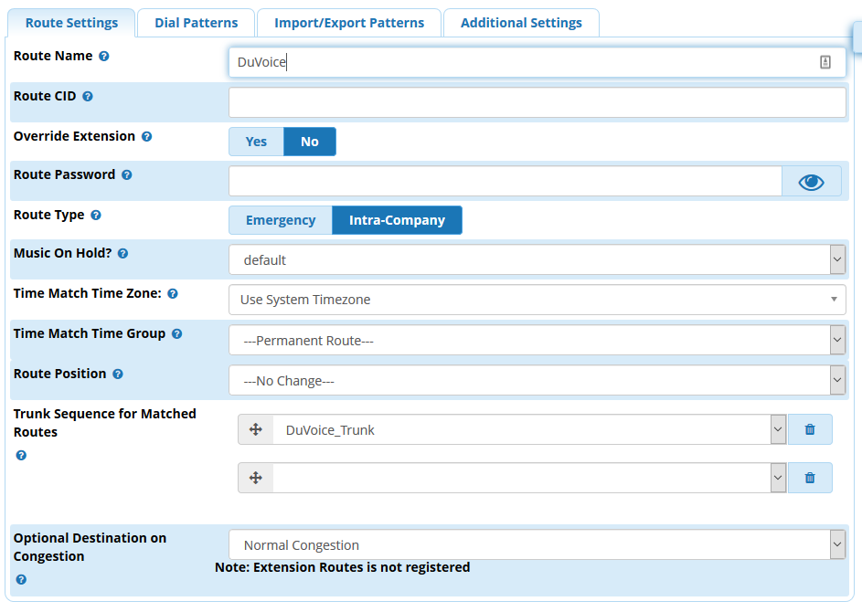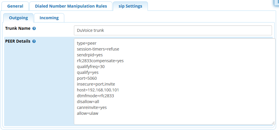 In this example the DuVoice system is located at IP address 192.168.100.101 and we will be using 2000 as our trunk extension.