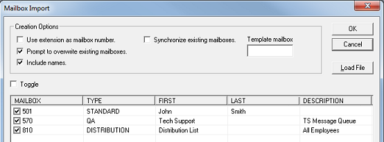 In this example, the first line specifies that the columns are the mailbox number, the mailbox type, the first and last names, and the start and end range values. The first record creates a single mailbox, 300, with the first name John and the last name Smith and all other settings defaulted. The second record creates 9 guest mailboxes, numbered 601-609, and uses the appropriate defaults for all other settings.