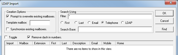 - Only the following fields can be imported using LDAP: mailbox, extension, first and last name, description, one email address, and two phone numbers (mobile and home)