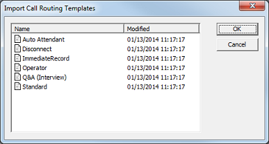 To import a template file, click Import. This will open a dialog that lists all available factory default templates of the given template type. The figure below shows the Import dialog for call routing templates: