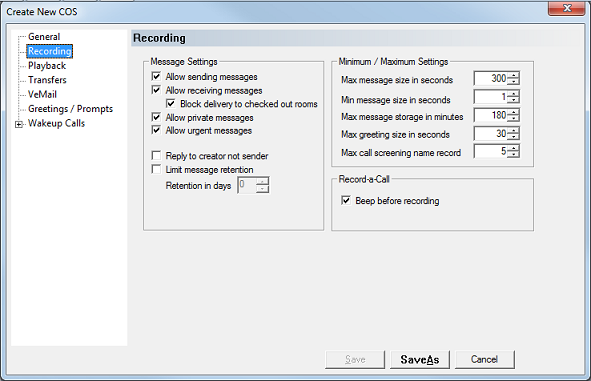 This section contains settings that control the minimum and maximum sizes for various recordings as well as the total amount of message storage space allowed for each mailbox.