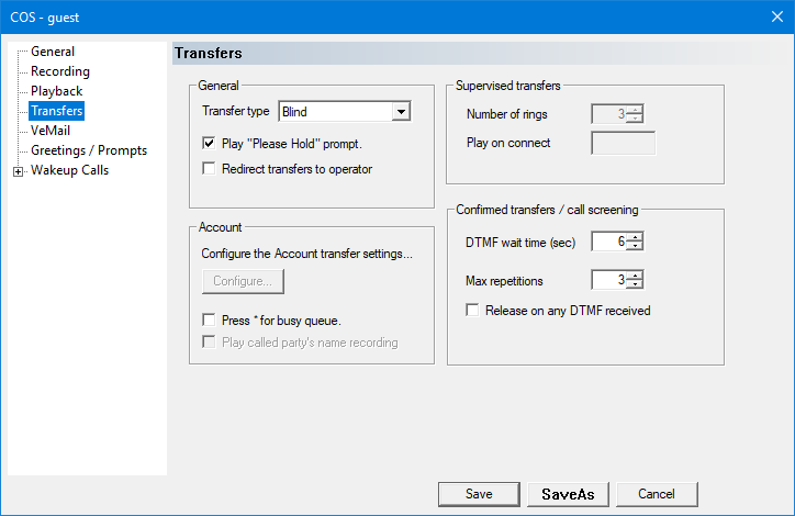 | Play “Please Hold” prompt | If enabled, the system will play “Please hold while I try that extension” prior to attempting the transfer. Applies to all transfer types. |