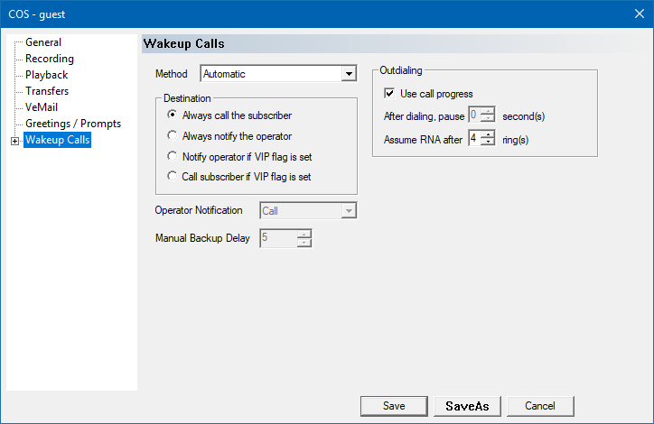 | Use call progress | If enabled, wakeup calls will be performed using call supervision. The exact type of supervision depends on the transfer type specified on the Transfers page. If disabled, the system will just dial the extension, wait the specified number of seconds, and then start playing the message whether the call was answered or not (as it has no way of knowing). |