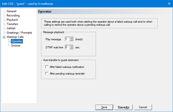 | Enabled | If checked, the option to schedule a wakeup call will be voiced in the subscriber menu (but only if the mailbox is of type guest). If not checked, the wakeup call option will not be available in the guest subscriber menu, however the wakeup calls can still be scheduled by the PMS or by the administrator (via InnDesk). |
