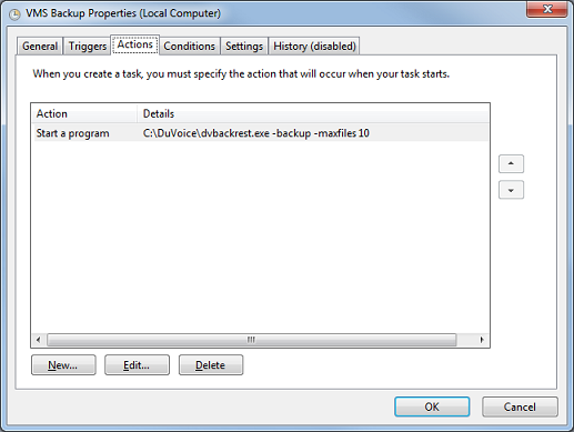- On the VMS Backup Properties dialog, select the Actions tab. Double-click on the entry in the table, or select it and then click Edit.