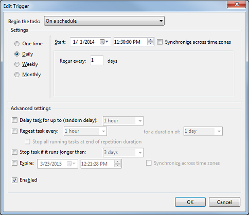 - A full discussion of the options on the Edit Trigger dialog is beyond the scope of this document. However, you can use the settings on this dialog to change the frequency of the task (daily, weekly or monthly) as well as the time of day when it will be performed. Advanced settings provide further refinement (but for most cases should all be left disabled). The last setting at the bottom of the dialog, Enabled, should remain checked. If unchecked, the task will be disabled and backups will not be performed.