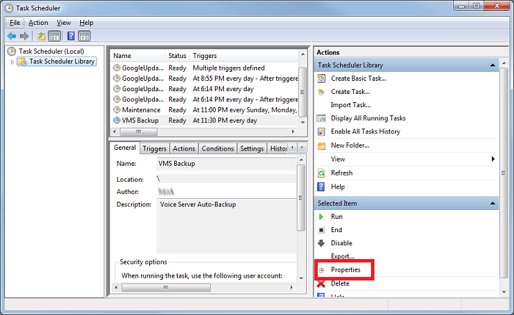 - In the left pane, select Task Scheduler Library. Then, in the middle pane, select the VMS Backup entry.