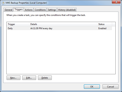 - On the VMS Backup Properties dialog, select the Triggers tab. Double-click on the entry in the table, or select it and then click Edit.