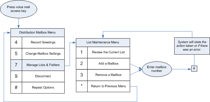 When you select the option to manage lists and folders, the system automatically routes you to the distribution list maintenance menu shown in the flowchart below.