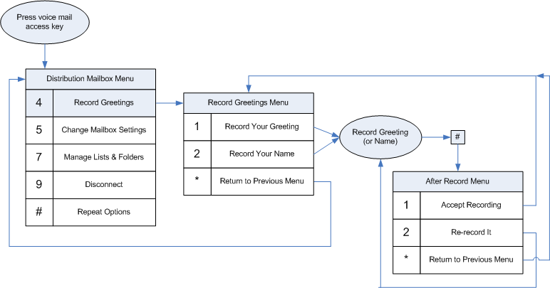 This flowchart provides an overview of how to record (or re-record) the name and personal greeting for a distribution mailbox.