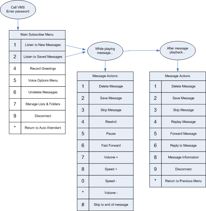 | Message information | 8 | Plays a detailed history of where the message came from and when it arrived. For messages from outside callers, the caller ID may be played if it is available, otherwise the system will just say that it was from an outside caller. Forwarded messages include information about when the original message was recorded. |