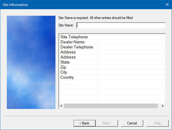 On the Site Information page, you must, at a minimum, enter the site name and a site phone number. Dealer name, phone number, and address may optionally be entered as well. When finished, click Next to continue.