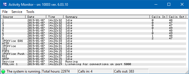 To start the system, select Service | Start from the main menu. A stoplight icon at the far right of the status bar (lower right corner) will change from red to yellow to green. Once the icon changes to green, the system is running, although it may take a few moments longer for the Line entries to display Idle (as shown in the figure above).