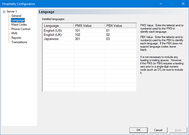If you change the PMS or PBX protocol in use, then you may need to change these values appropriately. To do so, left-click the mouse pointer in the appropriate space provided in the PMS Value (or PBX Value) column and type in the character(s) used by the PMS (or PBX) to identify each language. It is not necessary to include leading or trailing spaces, but leading zeros should be included.