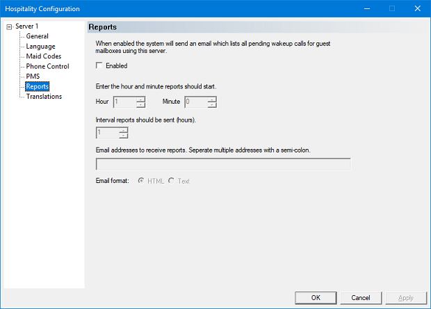 The Reports page of the Hospitality Configuration dialog is used to configure the feature. Access this page by selecting Features | Hospitality from the main menu, then select Reports as shown below.