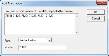 You can add a range of translations by simply entering the starting value, followed by a dash, followed by the ending value. Ranges can be interspersed with individual entries, as shown in the figure below: