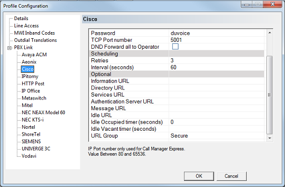 The DuVoice v7 can link to a Cisco Unified Communications Manager PBX (CUCM) using a TCP connection where the PBX is the server. This link uses the protocol and features listed in the table below: