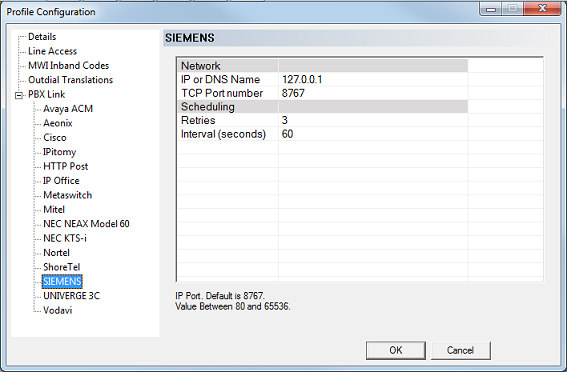 | TCP Port number | 8767 | Enter the port number used to establish a connection with the SIEMENS PBX. The default for this PBX is 8767. |