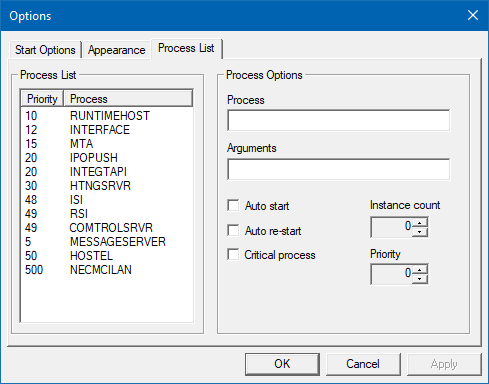 | Process List | The list of processes that will be started. |