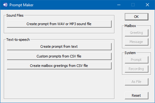 Using the Microsoft Text-to-speech engine and a CSV file containing prompt numbers and scripts will generate custom language prompts. - Create mailbox greetings from CSV file