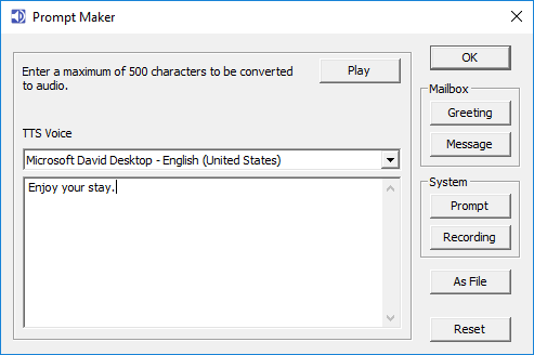 | TTS Voice | Choose between Microsoft David and Microsoft Zira for your prompt voice. |