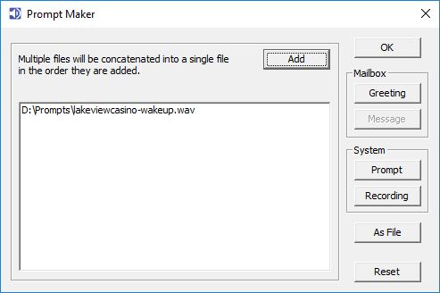 Multiple files can be chosen, they will be combined together in the order they are added. In this example we have a professionally recorded WAV file which is the welcome greeting and a professionally recorded MP3 file of the hotels name.
