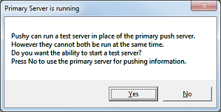 When you run the application, the first thing it will do is display a dialog (similar to that shown below) informing you whether the primary push server is running and asking if you want the option to run a test server.