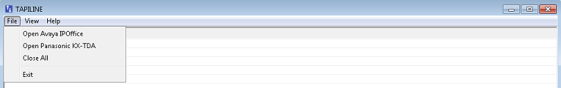 When TAPILine is initially started, it displays only a blank window. Before it can display any integration data, you must first establish a connection to the PBX. Select File from the main menu as shown in the figure below. Then select either Open Avaya IPOffice or Open Panasonic KX-TDA, depending on which PBX your system is connected to.