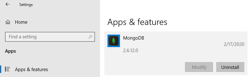We must first uninstall the existing database server from Windows Settings | Apps & features. This can also be performed using the control panel via Programs and Features.