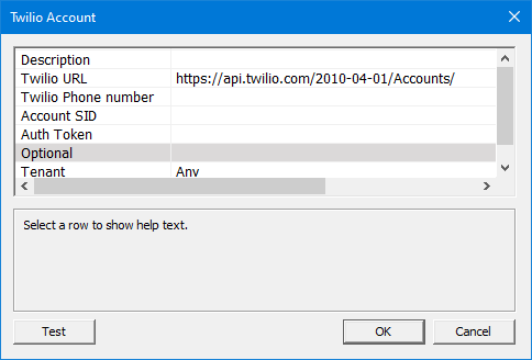 | Twilio URL | Do not change unless the default is no longer supported. Default is https://api.twilio.com/2010-04-01/Accounts/ |
