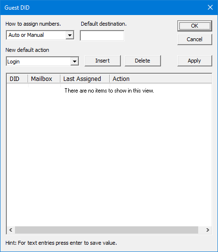 | Fixed | DID numbers must be assigned using this dialog. InnDesk is blocked from making assignments and no automatic assignments will be made at any time. |