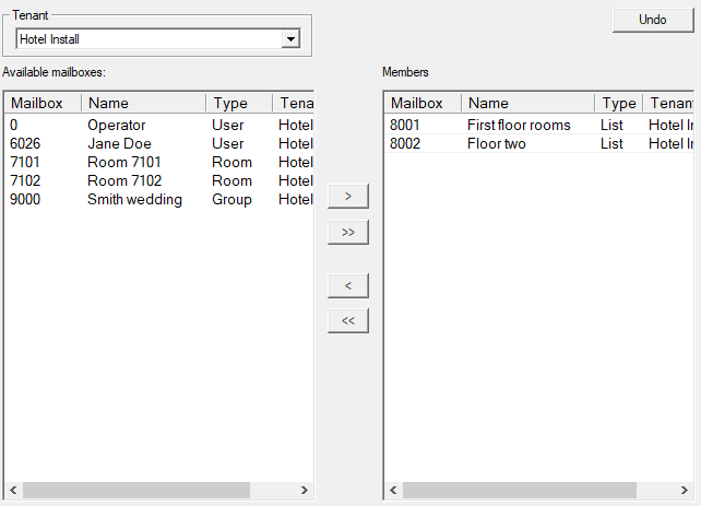 The table on the right lists the current members of the group, displaying the mailbox number, the name and the mailbox type. The list box on the left contains all other eligible mailboxes in the system. Eligible mailboxes include lists, room and user mailboxes.