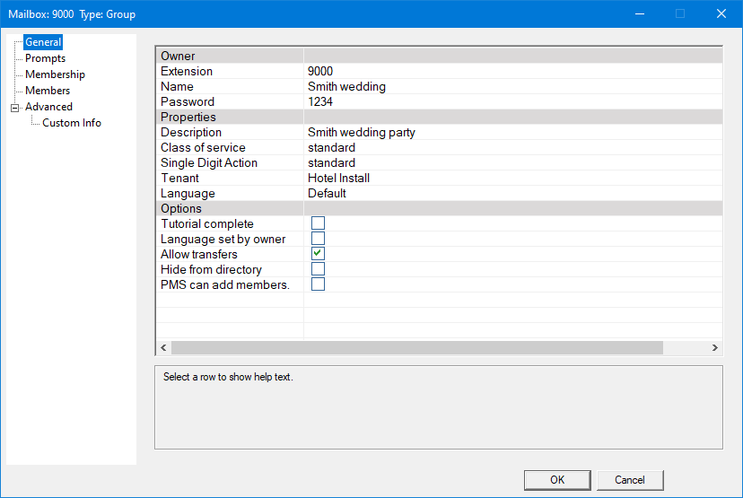 | PMS can add members | Can the PMS add members to this mailbox automatically. This feature is used when the PMS sends an alpha numeric group code on a check-in. A pool of group mailboxes must be created with this feature enabled. The DV2000 will automatically use one of these mailboxes and insert the group code into the name field for that guest and any future guests to be included in the group. Note: Numeric group codes automatically create a group mailbox and does not require a pool of group mailboxes to be created beforehand. |