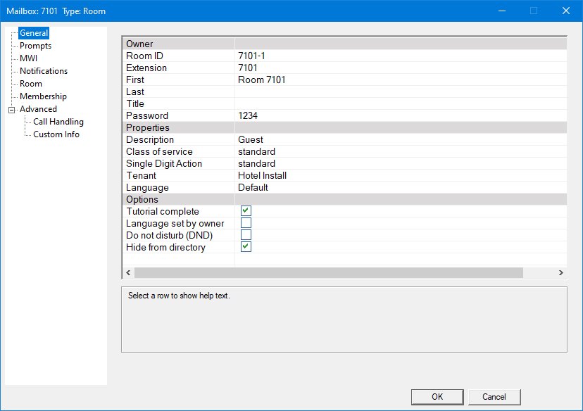 | Tutorial complete | This setting is automatically checked for guest mailboxes. Uncheck this box if you want to go through the tutorial again. Warning: This will delete the greeting and the name recording. |