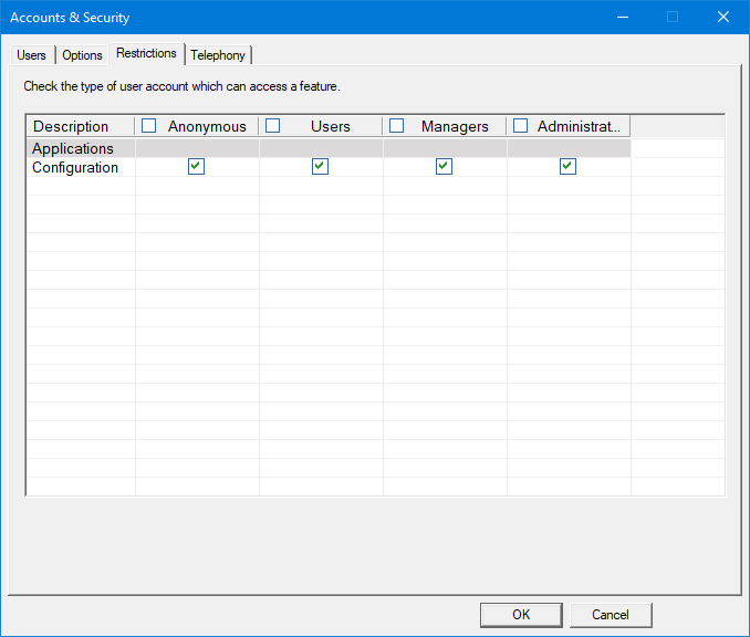 For each application, you can configure which user types can access the application: Anonymous, User, Manager and Administrator. Check the boxes for the user type(s) who should have access and uncheck the boxes for those who should be denied access. Any changes will be saved when you click OK.