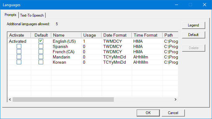 | Activate | Check this box to activate the language. Uncheck it to deactivate the language. You can only activate as many languages as your license allows. By default, you can have up to 4 languages in addition to U.S. English (which, as shown, is always activated). If an entry in the table is grayed-out, that means it cannot be activated because you already have the maximum number of languages activated that your license allows. In the dialog above, the language Italian cannot be activated because there are already 8 languages activated (besides U.S. English), the maximum licensed for this system. You cannot deactivate a language if it is marked as the default language, nor can you deactivate U.S. English. Additional language prompt sets may be installed, and therefore listed in this dialog, but you will not be able to activate more than the number licensed. |